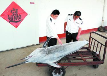 當(dāng)日,經(jīng)市漁政部門工作人員測量,該魚體長2.84米,初步鑒定為旗魚,非國家保護(hù)的水生野生動物。